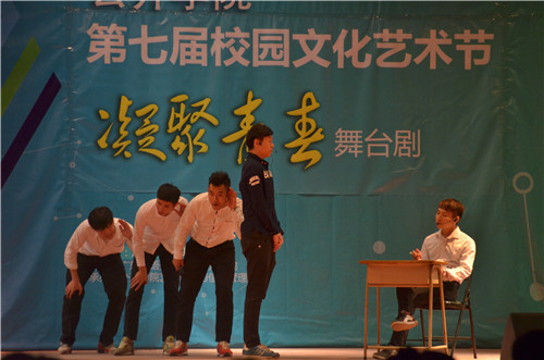 演出由吉他协会的一首串烧歌曲作为美妙的开场白。随后,主持人宣布舞台剧正式开始,首先上台表演的是16级电商班的《校园》,充分演绎了大学生从颓废到努力学习及走向毕业的故事,揭露了现代人沉迷于网络自我颓废的现象。紧接着15级电商班的《职场》说明踏入社会所要面临的各种工作挑战,经过磨练演变成脱颖而出的职场成功人士,表现了青春应该有的积极向上的模样。16级环艺班带来的是精彩的小品《青春的导航线》。小品以极具喜感的情节和表演让观众看到了见义勇为的大学生,体现了青春正盛中的勇敢及当代大学生的责任感。