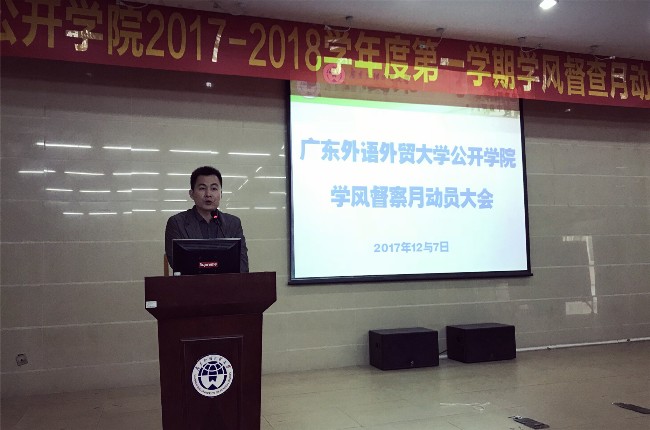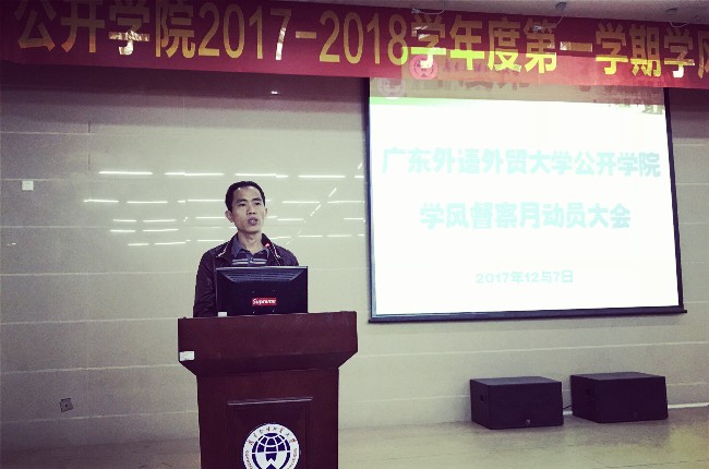 陈秋林作总结发言。他指出,环境育人,创造良好的育人环境是我们公开学子共同努力的方向,这就需要全体学生严格遵守学校的规章制度,注意自己的一言一行,时时刻刻用“广外人”要求自己的言行。陈秋林强调,广大学生要重视学风建设,只有社会认可了我们的学风和育人环境,才会认可我们的毕业生,这与在座各位是息息相关的。