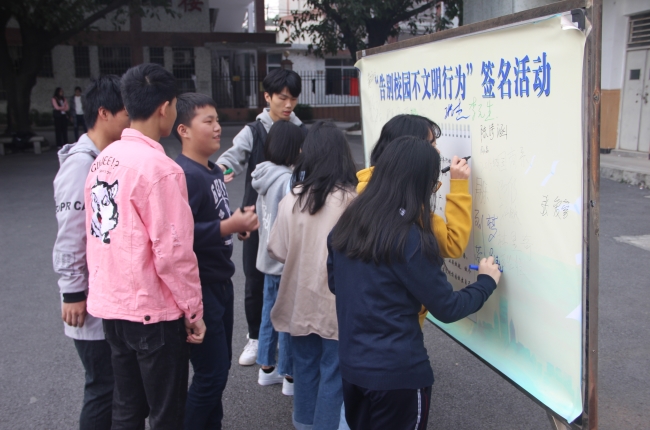 升旗礼毕,由团总支组织部部长带领全体同学庄严承诺:“同学们:你我一心齐行动,创建文明好学风,向校园不文明行力“宣战”。我要做到:一、上课认真听讲;二、爱护校园环境;三、宿舍整洁干净;四、校内不养宠物;五、养成良好作息;六、男女交往文明;七、诚实守信考试;八、节约水电粮食;九、杜绝校内吸烟;十、使用文明用语。让我们从现在做起,从我做起,做一名文明的大学生,为创建文明校园做出自己的努力!”随后,各班代表有序上前在告别校园不文明行为板上签上自己名字。