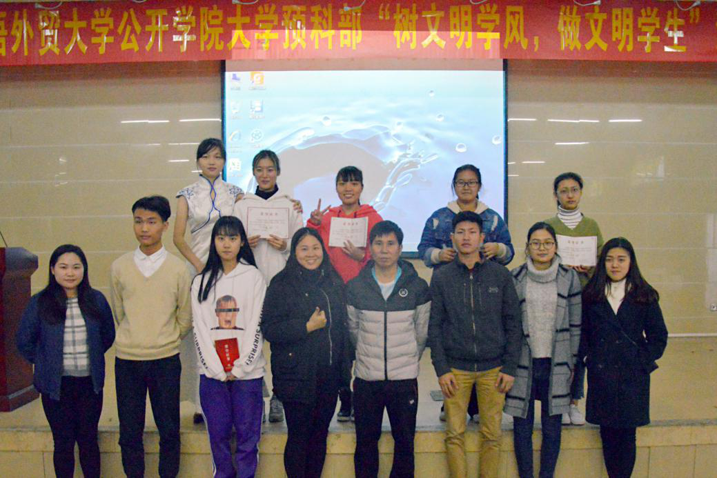 本网讯 为了响应学院“学风建设月”,加强学生纪律教育,强化学生的文明礼仪修养,公开学院大学预科部于12月18日下午4点在学术报告厅举办了“树文明学风,做文明学生”演讲比赛。出席本次活动的评委老师有大学预科部副主任赵正苗、辅导员金晶晶、梁海峰、桑巧丽、陈锦婷。