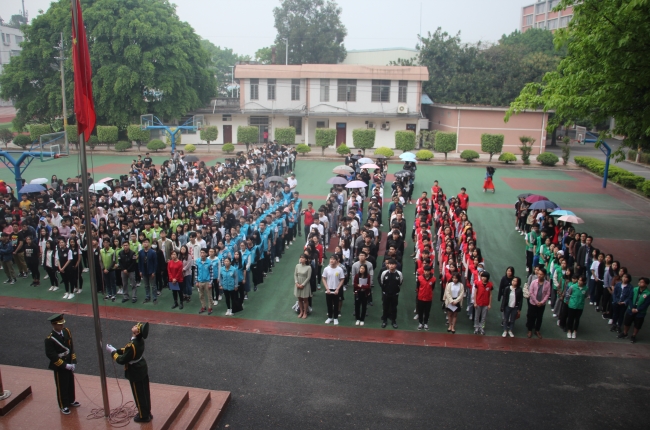 升旗仪式7点准时开始,虽然天气下起了小雨,但是我院师生毫不畏惧,陆续来到篮球场,并有序地排队,个个精神饱满,抬头挺胸,等待着国歌庄严响起、五星红旗冉冉飞扬。7:15分,伴着《义勇军进行曲》的响起,全体人员齐唱国歌、行注目礼,庄严肃穆。
