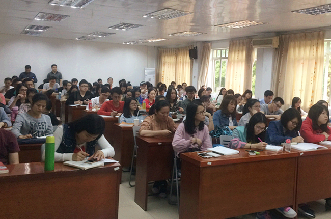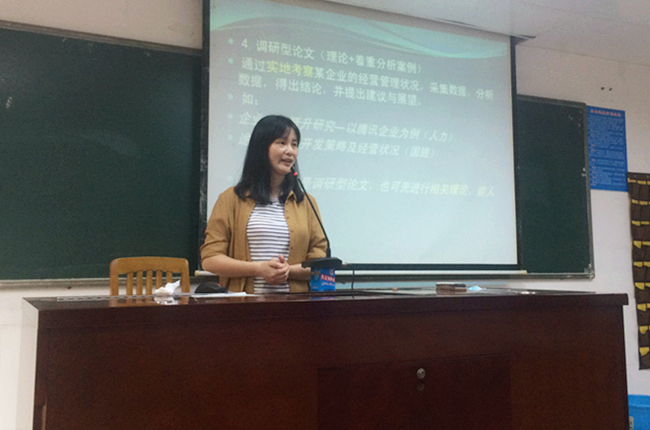 接下来,由杨妙新作关于毕业论文撰写的讲话,她主要从撰写毕业论文的目的、意义和基本步骤;论文的选题;资料的搜集和运用;毕业论文的基本结构;撰写论文的注意事项等五个方面详细的为学员们作讲解指导,学员们认真听讲,或手写笔记,或手机录像。首先,她跟大家解读了什么是毕业论文,并提出了撰写论文的意义:论文是展现理论水平和实践能力的一种实践活动,是对大学所学知识的总结;接着,她根据实际情况,以保险业务为例,为人力资源管理和国际旅游管理两个专业的学员选列了一些论文题目、选题的原则和基本的框架,从他们的实际工作出发,理论结合实际,这样的方式,让学员们更容易理解,学员们心中也有了自己论文的大致提纲了;再者,她根据学员生活中的住宿分布情况,给她们提供了可以搜集论文资料的图书场所、一手数据,以及网络信息;最后,她从几个需要注意的细节向学员们作了注意事项提醒,包括字数、字体、格式等方面。同时,她也预祝大家通过本次的讲座,能撰写出一篇内容丰富,观点鲜明的毕业论文,为自己在广外求学之路画上圆满的句号。
