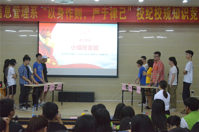 本网讯 5月14日晚,公开学院艺术设计与信息管理系在学术报告厅开展“以身作则,严于律己”校纪校规知识竞赛,参赛队伍共有6支,分别为17级平面广告设计本科班、17级平面广告设计专科班、17级服装设计与工程专科班、16级电子商务立交桥班、17级会计专科班、17级室内装潢设计专科班。