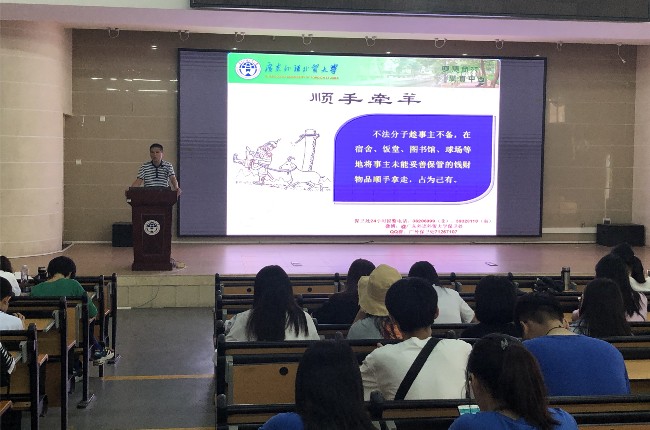 讲座中,谭玉锋从“防盗”、“防骗”、“出行”、“消防”四个方面进行讲解,教会学生如何保护自身利益,减少不必要的损失。在“防盗篇”中,谭老师说防盗意识要时刻警醒,宿舍、图书馆、饭堂、运动场、偏僻场所都是特别容易发生盗窃的场所,例如有的同学进出宿舍不随后关门,或者在图书馆用书包占位,又或者在运动场把背包随手乱放,这些不良习惯都会给不法分子有机可乘,从而丢失自己的财物。讲到“防骗篇”,谭老师特别告诫广大同学,一定不要贪图蝇头小利,“天上掉馅饼”这样的事情是不会发生的,对于转账转钱这样的事情一定要敬小慎微,三思而后行。在讲到“消防篇”时,谭老师特别讲解了“学生宿舍防止火灾要点”,从“不乱接电源”、“不乱扔烟头”、“不点蜡烛照明”等九个方面辅以案例,给学生们详细讲解,警告同学们一定要提高安全防火意识,从自身做起,凡是不安全的事情都不能做。