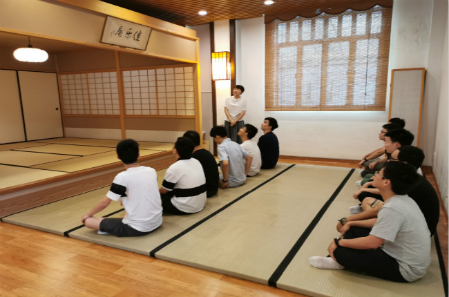 随后学员们观看了茶道表演。茶道核心——“和•敬•清•寂”作为日本400多年的茶人的行为准则,反映着日本独特的文化内涵。“和”即调和之义,人与人、人与自然、乃至茶道具及其使用方法这一切都要达到和谐。“敬”即尊敬之义。尊敬是对于所有事物的,它是来自于对那些事物存在的一种感谢之情。“清”即纯粹之义,不仅指实际的清洁,还包括净化心灵及发自净化心灵的言行。“寂”即和平的心境。观看表演的同时,杜凡老师解释说,饮茶者应先双手接过茶碗,轻轻转上三圈,使碗上的花纹图案对着送茶者,然后将茶碗举高至额头前,以示感谢,再慢慢品尝。据了解,茶室壁龛上挂着的“松寿千年翠”字幅喻示了日本茶道精神永远流传的美好愿望。