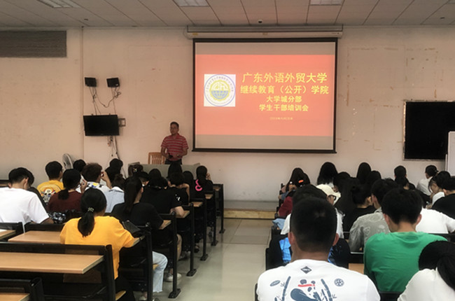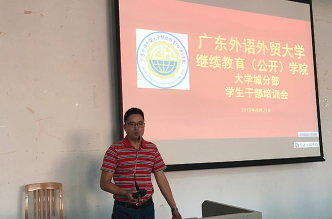 本网讯 为了增强学生干部的综合能力,提高学生干部的业务水平,9月25日晚,大学城分部在F座教学楼208课室召开学生干部培训会,本次会议由学生工作办公室副主任李清伟主讲,培训对象为大学城分部全体学生干部,共计150余人。