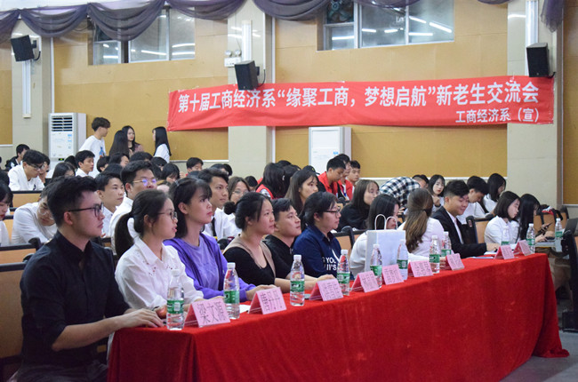 本网讯 10月30日晚,工商经济系在学术报告厅举行“缘聚工商,梦想起航”新老生交流会,工商经济系主任余惠琴、团学指导老师梁文源、全体新生、老生班干参加,此外大会还邀请了往届优秀毕业生雷梦皎出席。