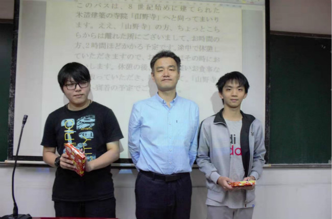比赛结束后,外教前田哲对选手们表现进行点评,他首先肯定了同学们在比赛中的表现,指出了他们的优点和不足,并点明了同学们日后的努力方向,指出促音和长音是日语发音的难点,希望在场同学能够通过观看比赛,借鉴长处,修正不足。经过评委打分,最后张宇坤和郭晓晖荣获一等奖,马进鸿、刘凯文和潘志远荣获二等奖,张世莹和张茵茵荣获三等奖。