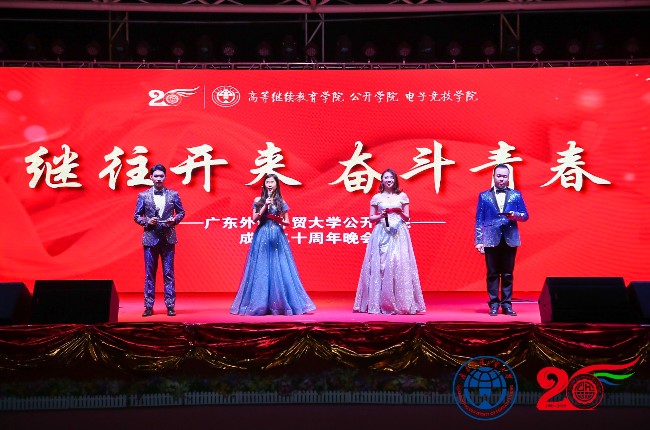 本网讯 春华秋实,时光荏苒,誉满天下,桃李芬芳。12月7日晚,广东外语外贸大学高等继续教育学院、公开学院、电子竞技学院成立20周年晚会在白云湖校区大舞台隆重举行。武汉大学继续教育学院院长甘泉、浙江越秀外国语学院继续教育学院院长俞晓凡、广东外语外贸大学团委书记纪彬、广东外语外贸大学就业指导中心副主任娄会东、我院领导班子及各教学单位领导出席,来自省内外高校及机构的来宾和师生近千人观看了晚会。