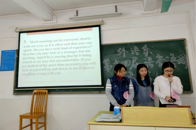本网讯 公开学院外语系第十四届英语语音语调大赛于12月12日晚上7点在三教503顺利收官。外语系主任王蓉和教研室主任刘捷捷担任评委,副主任周联兵出席。