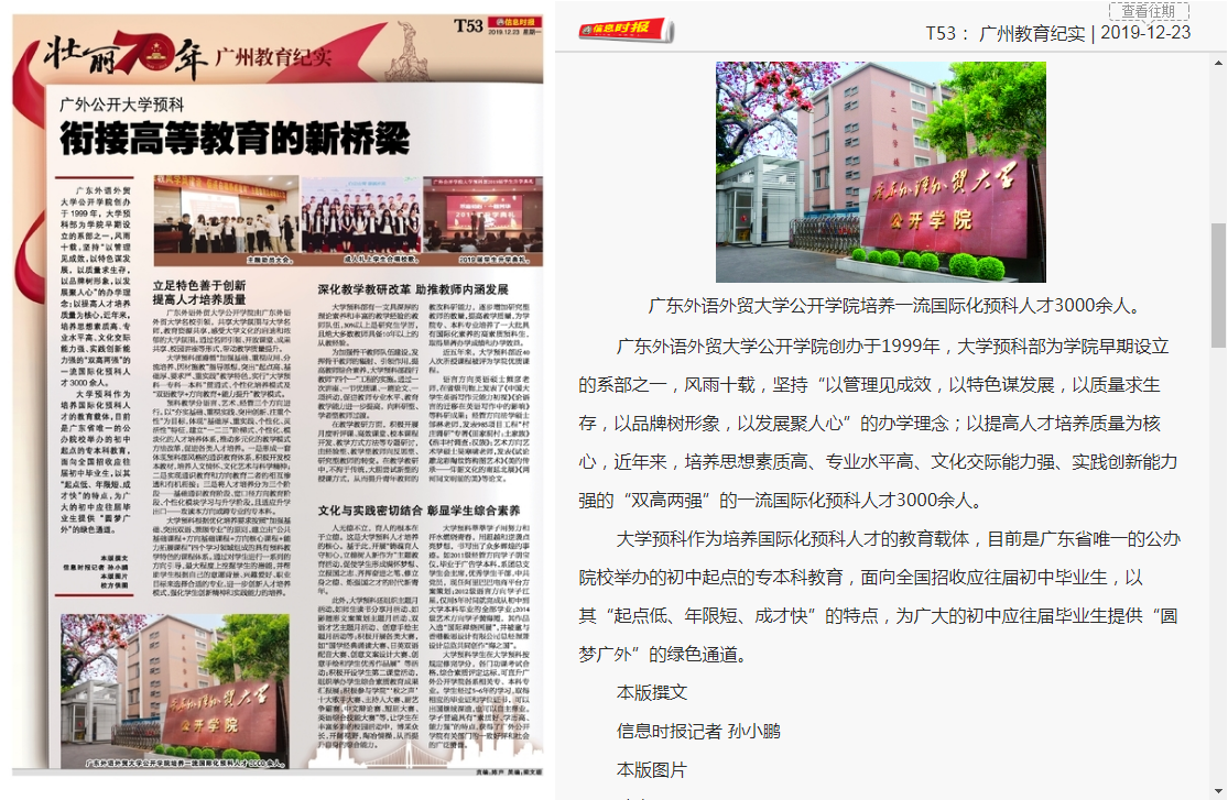 本讯网 2019年12月23日,信息时报特刊“壮丽70年,广州教育纪实”发表文章《广外公开大学预科 衔接高等教育的新桥梁》,以真实、客观的姿态,从办学理念、办学特色、人才培养等方面详细梳理了广外公开学院大学预科部教育发展的成果。
