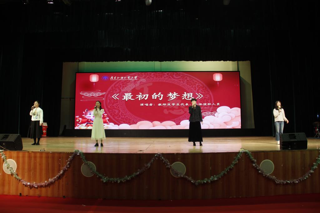 最后,大学城分部师生代表合唱《最初的梦想》,将晚会又推向了一个小高潮。喜气洋洋的新年歌曲响起,我们初心不变,带着对新年的美好憧憬,踏上新的筑梦征程。