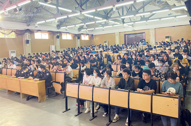 警官们以风趣幽默的语言讲述一个个案例,现场学生聚精会神。视频案例生动且深刻地展示了诈骗的套路和手段,帮助同学们保持警惕,不被套路。
