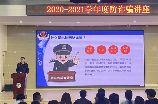 讲座主要针对防范诈骗对同学们展开知识讲解。吴凡警官首先通过骗子的诈骗手法为同学们解析,从“手机短信诈骗”、“电话诈骗”“网络电话诈骗”“互联网诈骗”四个方面引入,防范电信网络诈骗。吴警官指出,由于电信网络诈骗具有非常大的隐秘性,容易得手且侦查破案困难重重,追回款项时长久,告诫同学们一定要擦亮双眼,仔细侦查接收到的信息以防落入诈骗分子的陷阱。