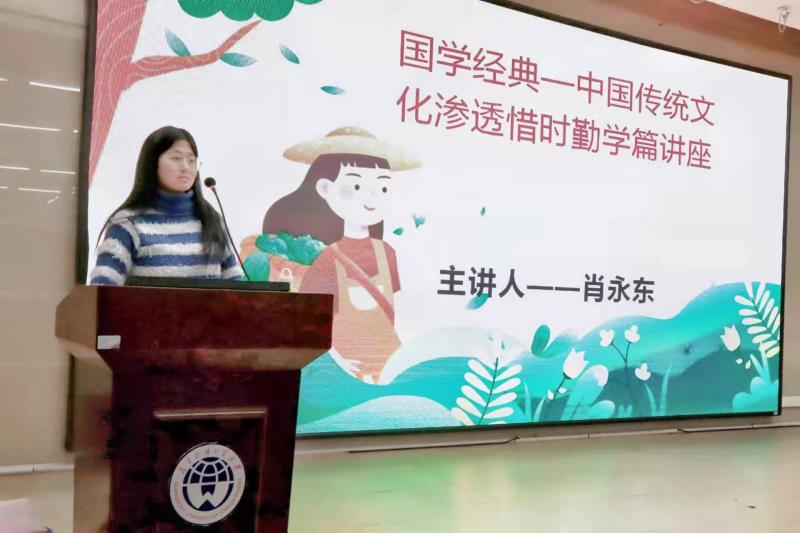 肖永东老师为预科学生作“国学经典——中华传统文化渗透之惜时勤学篇”讲座。肖老师首先向同学们介绍了国学的具体内涵和发展历史,重点解读了儒家经典《论语》,激发同学们对国学经典文化的了解兴趣。随后,肖老师紧扣“惜时勤学”主题,讲解了明代钱福的《明日歌》、北宋汪洙的《勤学》、囊萤映雪、三冬文史足用、战国荀子的《劝学》、元代翁森的《四时读书乐·春》等诗歌、典故。同学们感受到古人对学问的孜孜追求,被国学经典的博大精深、源远流长所深深震撼。在经典诗文的熏陶中,肖老师渐次引导同学们思考“获得学问的一个前提条件是什么?”、“我们为什么要勤学?”、“我们要怎样做到勤学?”等问题,最后引用《诗经·曹风·鳲鸠(shī jiū)》中的“鳲鸠在桑,其子七兮。淑人君子,其仪一兮。其仪一兮,心如结兮。”说明君子要保持内外兼备、始终如一的品行,教导同学们在求学的道路上,要专心致志、脚踏实地、甘于淡泊、坚持不懈。