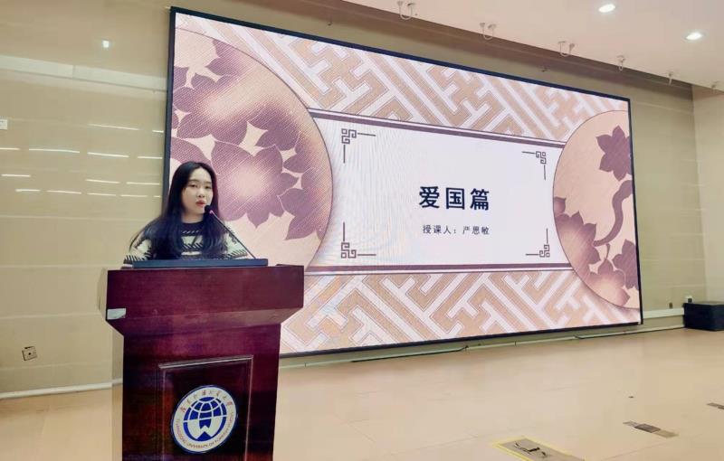 严思敏老师的讲座主题是“国学经典——中国爱国精神与传统文化传播”,她从中华民族传统节日入手,讲述了我国传统节日的一系列民俗活动,通过五首爱国古诗词宣扬杜甫和文天祥等爱国诗人报效祖国的强烈愿望。古人的壮志豪情,民国时陈延年的革命奉献,抗日战争时杨靖宇的临危不惧,还有近期热门的医保谈判事件,讲座引领全体同学带着爱国情怀以及强烈的民族认同感和归属感,从源远流长的历史中一步步走来。严老师鼓励同学们努力学习,寻找自身闪光点,找到目标,做好每一件小事。精益求精亦是爱国。