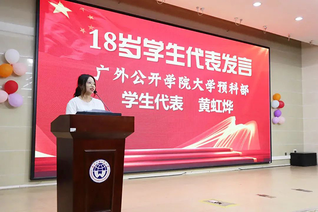 大学预科部常务副主任周蔚明寄语同学们坚定理想,不负韶华,在服务社会中践行社会主义核心价值观,认真走好人生道路,拓展自我价值与社会价值。教师代表高嘉怡阐述了十八岁的意义,叮嘱同学们要在心智上更加成熟,希望同学们“手要把握住现在,脚要紧跟住时代,心要永远憧憬着未来”。学生代表黄虹烨表示要怀揣梦想,紧握希望,昂首面对已经成年的自己,让青春之花开得更热烈,让追梦的脚步走得更坚定。