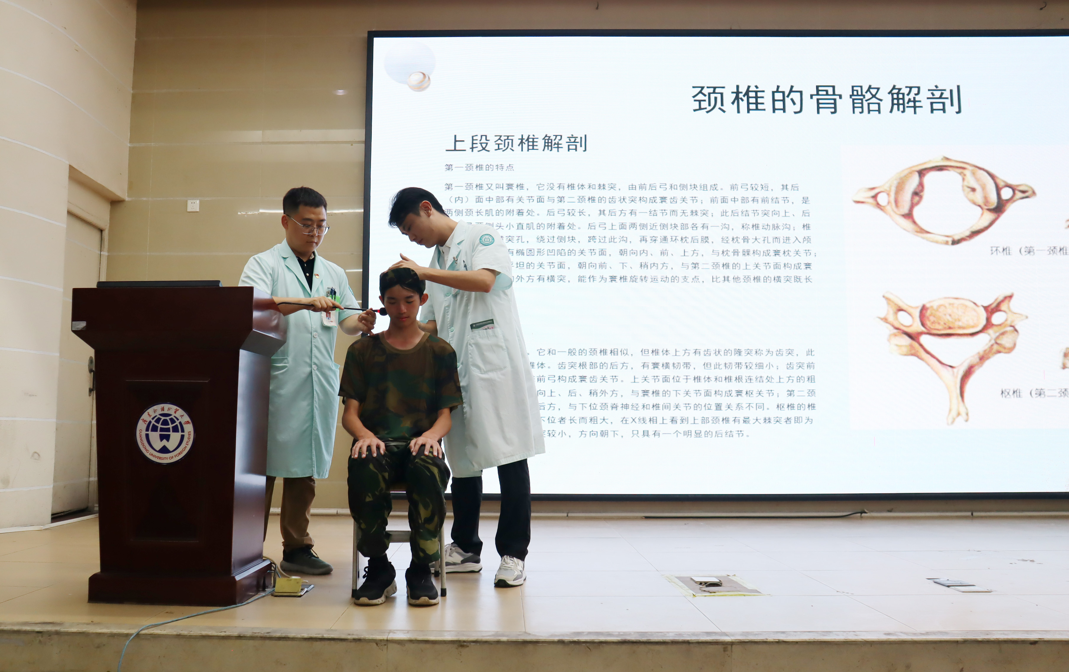 袁伟坤医生通过图文并茂的课件、通俗易懂的语言,从颈椎病的定义、颈椎病的分类及临床表现、患颈椎病的原因预防及措施、保健方法等方面进行了阐述,向同学们普及了防治、养护颈椎病的常识,传授了预防颈椎病的相关方法和实操技巧,激发大家对身体健康的关注,并将颈椎养护行动落实到生活中。