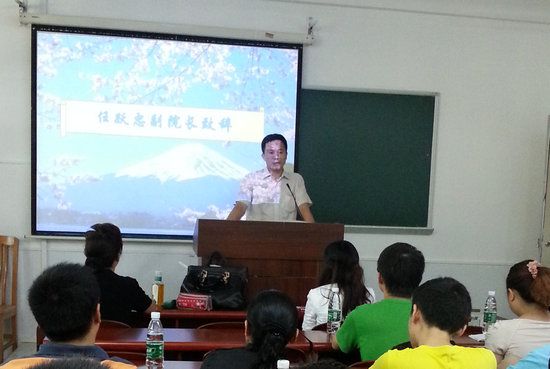 会议的第一个议程是副院长任跃忠致辞,他首先对新生及家长表示亲切的问候,并介绍了学院及日语浸泡营的发展历程,尤其肯定了日语浸泡营学生在院系各项活动及学习上取得的优异成绩,将更大的成绩寄希望于2013级新生们。