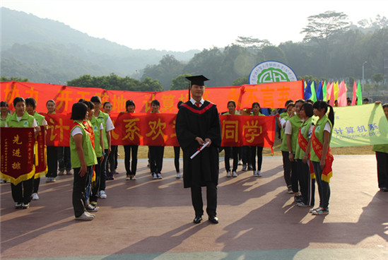 在雄壮的音乐声中,商务英语系同学们登场了。他们运用红扇整齐划一的摆出“商英之活动,公开之不朽 ”的字样吸引了全场同学的目光。创意动漫系同学以其精彩的热舞表演博得了台上台下的阵阵掌声。英语系方阵用彩绸拼出了奥运五环,展示了 “更高,更快,更强”的奥利匹克精神,顿时掀起了全场的高潮。最后一个登场的成教体系方阵,他们组织了各教学点的数十名运动员以积极饱满的热情参加了本次运动会。由于成教学生分布在校外各教学点,他们克服了路途较远,交通不便的问题积极组织学生参与,展示了成教体系的风采。