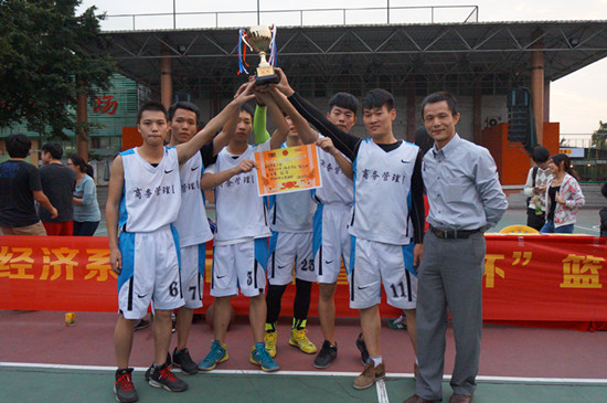 本网讯 为了丰富大学生的课余生活,提高大学生的综合素质,增强团队精神和集体凝聚力,展现大学生积极向上的风貌,2013年11月18日下午4点,激情飞扬的篮球场多了一群红色马甲交织、美女啦啦队的舞动弧线、运动健将大声呐喊的画面。工商经济系2013级新生们在篮球场举行“新生杯”篮球赛决赛,出席本次篮球赛的嘉宾有:系主任符群行老师、教学副主任王显雄老师、学工副主任余惠琴老师、学工主任谢蕊蕊老师、团学指导陆宏正老师、辅导员曾苗苗和林彩霞老师。