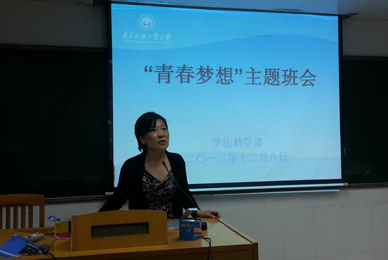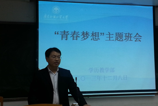 本网讯 12月8日下午,学历教学部在三教220举办了圆梦计划“青春梦想”的主题班会,目的在于树立积极向上的学习风气,激发同学们为梦想而奋斗的进取精神。12级、13级全体圆梦计划学生及学历教学部主任林碧玲、副主任巫盈出席了此次班会,班会由巫盈主持。