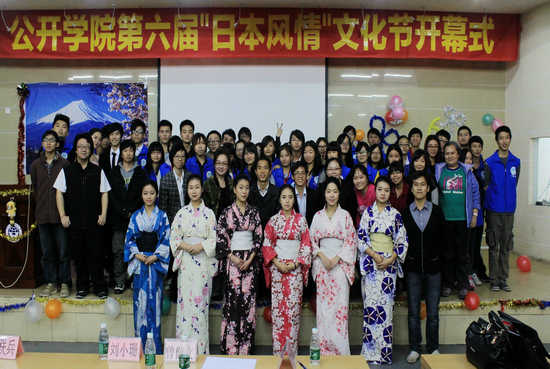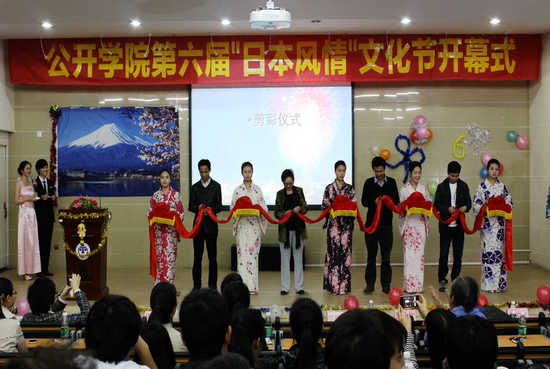 本网讯 12月9日晚,日语系承办的公开学院第六届“日本风情”文化节在学术报告厅隆重开幕。学院党委副书记曾健文、日语系主任刘小珊、学生工作办公室主任陈秋林、商务英语系副主任赵正苗、日语系副主任周联兵、日语系教研室主任钟晓光及日语系全体老师应邀出席了开幕式,近300名学生参加了开幕式。