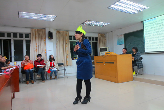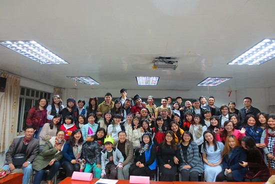 本网讯 12月26日周四晚,专门用途英语项目部英语听说级别的全体师生在三教220教室,隆重举办了第二届“发现英语文化表演”。到场嘉宾有外教Annie Rubienska , Alex Sisco,通用英语项目部的刁婷婷老师,英语听说级别的指导老师:董秀清、贺捷、陈洁以及全体学员。