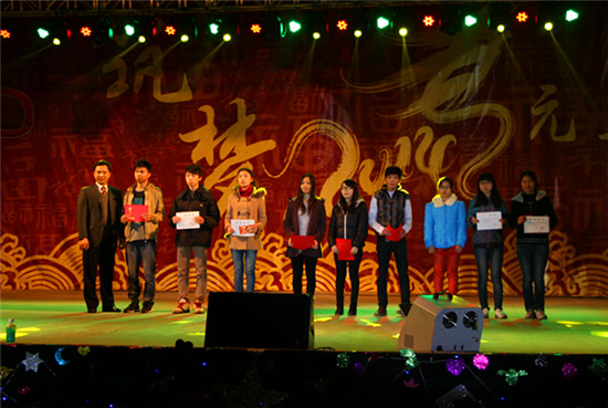 晚会上,何勇斌向师生们发表了热情洋溢的新年贺词,他代表学院领导班子向在过去一年里为学院发展做出贡献的师生表示感谢,对同学们在一年里取得的各项成绩表示了肯定,希望同学们在新的一年里再接再厉,取得更加优异的成绩,与老师们共同建设学院美好的明天。讲话结束后,进行了“统考高分奖”的表彰仪式,何勇斌和任跃忠为在2013年10月自学考试中获得全省最高分和单科85分以上的同学颁发了奖状和奖金。