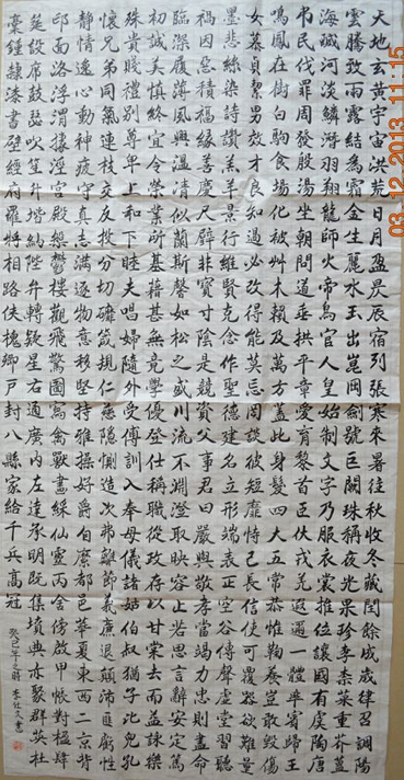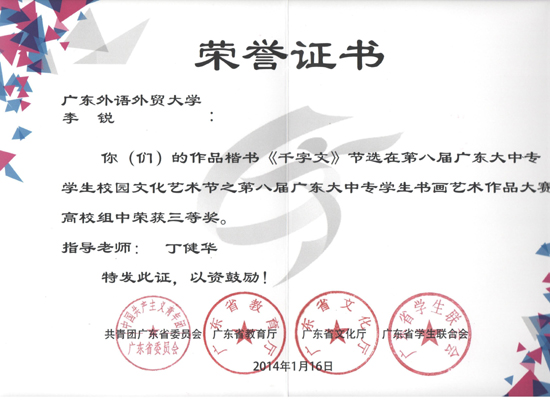 本网讯 第八届广东大中专学生校园文化艺术节活动在全省高校开展以来,公开学院团委在学生中大力宣传、广泛动员、认真组织,各系青年学生积极响应、热情参与。本次大赛,广东外语外贸大学共有八名学生获奖,其中来自公开学院计算机系13级平面艺术设计专业李锐的《千字文》楷书书法作品荣获三等奖,12级环境艺术设计专业李锋的油画作品《那些往事》获得优秀奖。
