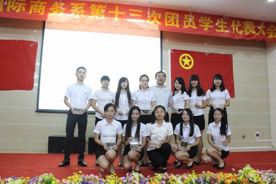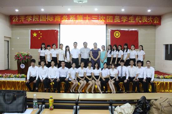 本网讯 2014年6月20日下午,广东外语外贸大学公开学院国际商务系第十三次团员学生代表大会在学术报告厅隆重举行。国际商务系副主任彭陟,辅导员李秋颖、李亚男,以及各系团学主席团及114名团员学生代表参加了会议。