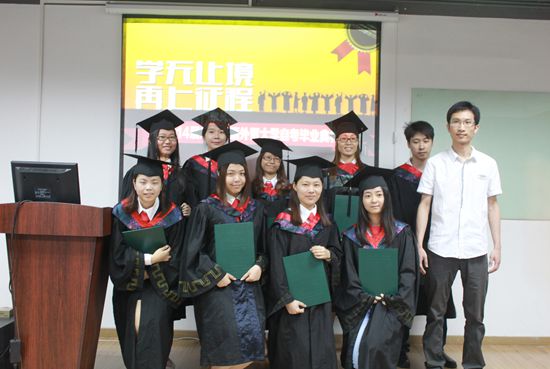 本网讯 毕业季,幸福季,也是启程季。2014年6月14日,我院自考独立办班点广东英卫培训中心毕业典礼在东圃校区隆重举行。出席典礼的嘉宾有英卫培训中心领导,广外自考办负责合作办学的谢朋鋆老师以及毕业班任课老师和负责学生工作的老师。
