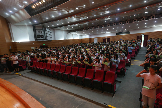 接着,2014级全体新生右手握拳,在新生代申恒禹的带领下,进行庄严的新生入学承诺宣誓,洪亮、整齐的宣誓声瞬间响彻典礼现场。最后,学院领导为各系新生代表颁发了校徽和学生手册。