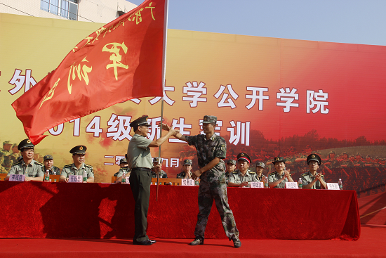 最后,院长何勇斌为军训部队授旗,军训教官进行了精彩的列队表演。随之将开始为期6天的2014级新生军训。