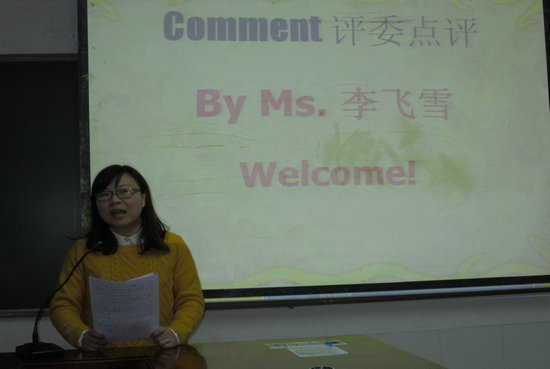 随后,李飞雪老师对本次比赛进行了点评,指出各参赛选手的优势与不足,鼓励同学们再接再厉。最后,主持人宣布了本次大赛各奖项获奖者:初级组冠军是A0202班胡家晨;高级组冠军是A0301班杨依扬。至此本届英语语音语调大赛圆满结束。