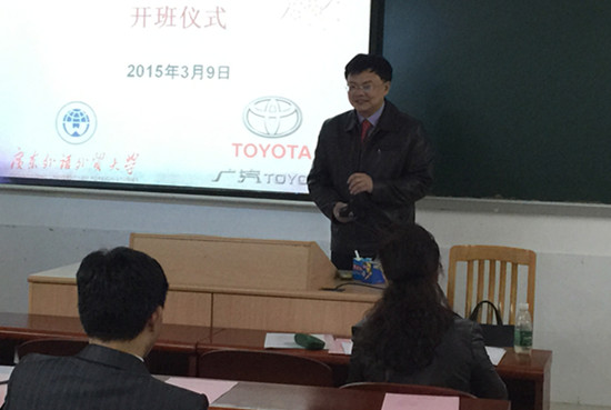 本网讯 3月9日下午,广东外语外贸大学继续教育(公开)学院与广汽丰田公司合作举行的第七期企业日语培训班在广外校本部第三教学楼113室举办开班仪式学院院长何勇斌、副院长任跃忠、日语系主任刘小珊、日韩语培训部负责人蔡京春及广汽丰田有限公司人才培养中心刘璐璐女士、广汽丰田发动机有限公司综合管理部关文蕴女士出席了仪式。仪式由蔡京春主持,全体参训学员与全体教师参加。