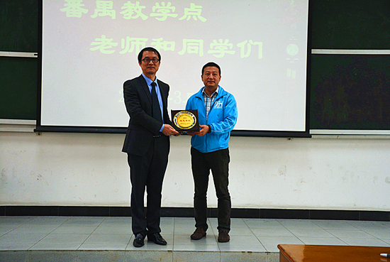 任跃忠首先致辞,他对新生们表示热烈的欢迎和诚挚的问候,并全面介绍了学院的发展历程,对同学们提出了殷切的期望,鼓励同学们要珍惜自己的大学生活,努力学习,培养优良的道德情操,成为真正的“白富美”和“高富帅”。接着,蔡彤发言表示感谢继续教育(公开)学院对番禺教学点的支持,并将继续通过优化教学管理壮大教育事业,培育更多优秀的人才。随后,新生代表黄堂堂畅谈了学习的规划和人生理想。最后,蔡彤为学院赠送纪念牌匾,对学院致以最真诚的谢意。