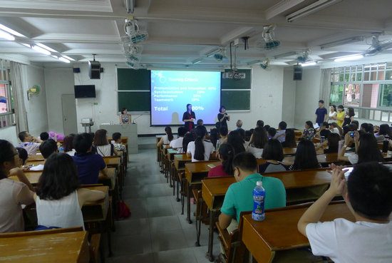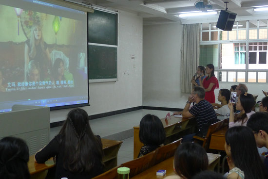 本网讯 6月11日下午,专用外语培训部第九届“魅力之声”英语电影配音大赛在本部二教114课室举行。主任吴文权、外教Mark、Ron及专职老师黄艳担任大赛的评委。全体老师及B、C类全体学员参加了活动。