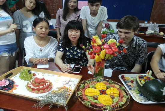 本网讯 6月11日晚,通用英语培训部英语浸泡营在本部第三教学楼103室举行了“英语水果拼盘创意"大赛。外籍教师Alex、教研室主任廖景智等老师担任评委。