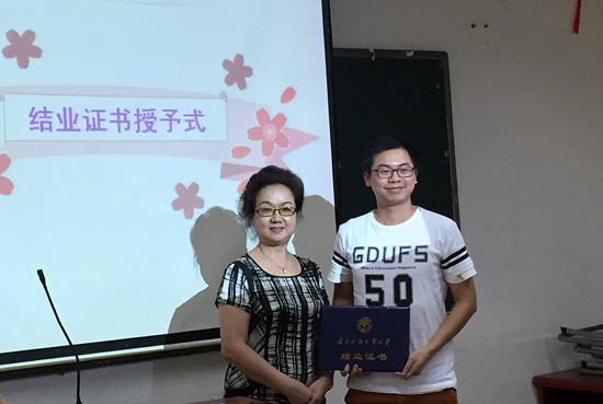 刘小珊针对教学情况进行了详细的总结报告。她充分肯定了培训成果,指出本次培训突出了广外特色,令学员在短时间内得到大幅提高,并提出将来要继续发扬互相探讨、因材施教的教学理念。最后,刘小珊为丰田学员颁发了结业证书。