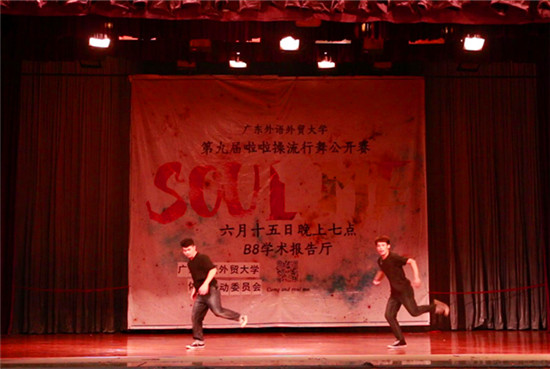 本网讯 6月15日,广东外语外贸大学第九届SOUL ME流行舞花球啦啦操公开赛决赛在大学城南校区B8报告厅隆重举行。我院代表多获得了流行舞小团体第四名和第八名,流行舞大团体第七名的好成绩。