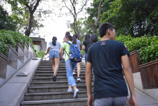 其次,我们来到了第二个目的地——“越秀公园”。进入到越秀公园,我们先来到五羊雕像前,在这里,我们听到了一个关于广州由来的传说:“在王八年(公元前887年),广州曾一度出现连年饥荒,田野荒芜,农业失收,人民不得温饱。一天,南海的天空突然传来一阵悠扬的音乐,并出现五朵彩色祥云,上有五位仙人,身穿五色彩衣,分别骑着不同毛色的山羊,羊口衔着一茎六出的优良稻穗,降临楚庭。仙人把稻穗给了广州人,并祝愿此处永无饥荒。五只仙羊也化为五块石头留在广州的山坡。从此广州便成了岭南最富庶的地方。”这就是广州有“五羊城”、“羊城”、“穗城”名称的由来。