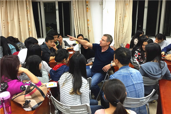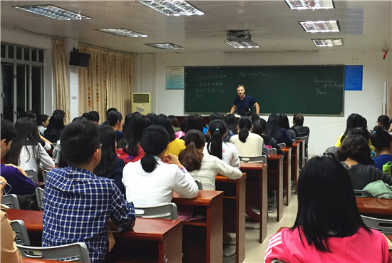 本网讯 11月30日晚上,继续教育中心在本部三教举办了外教英语角活动。本次活动的主题是年轻人感兴趣的Dating(约会)。外教Ron及Jennifer和Glenn应邀参加了本次活动,受到同学们的欢迎。