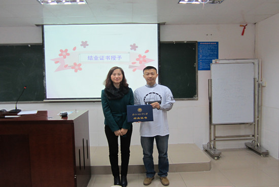 蔡京春针对教学情况进行了详细的总结报告。指出本次培训突出了广外特色,使学员在短时间内得到大幅度提高;提出将来要继续发扬互相探讨、因材施教的教学理念,为丰田公司提供更优质的培训服务。随后,她为学员颁发了结业证书。