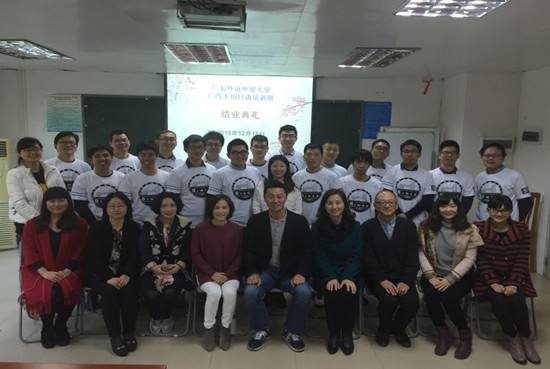本网讯 12月18日下午14:00,继续教育(公开)学院与广汽丰田公司合作举行的企业日语培训班结业证书授予仪式在广外北校区隆重举行。外语系日语教研室主任蔡京春及广汽丰田公司人才培养中心CO今井真哉、刘璐璐女士、培训班全体参训学员与教师参加了仪式。