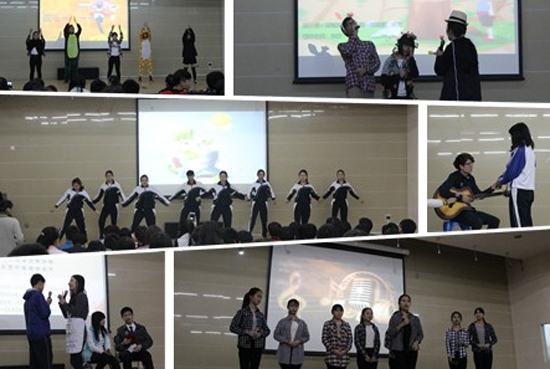 本次汇报展的表现形式以ppt和节目展示相结合,节目形式多样,内容丰富,包括舞蹈、歌曲、英语话剧、小品、健美操等十项内容。现场气氛热烈,台下坐无虚席,掌声雷动。其中,小品《数学100分》滑稽幽默的场面再现,使在场学生感同身受,学会了感恩父母;可爱日韩风的舞蹈《Blessing》带给了大家视觉上的冲击,话剧《守株待兔》,《梁祝》中西合璧,带领大家重温经典;小合唱《茉莉花》悠扬的旋律让人久久沉醉,《健美操》展示当代学生的勃勃生机,一场浪漫的《匆匆那年》将汇报展推入高潮,台上台下引起共鸣,分享着剧中人物的喜与乐。