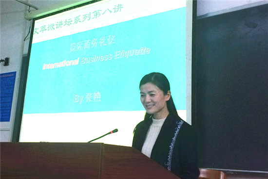 讲座于19:00正式开始,张艳首先从社交场合的各种“囧”案例着手,与同学们一起分析社交场合中的一些常见“失礼行为”,继而详细介绍了商务场合中的见面礼仪、着装礼仪、电话礼仪,包括寒暄、握手、互换名片的礼节、位次礼节、着装配饰的佩戴细节等。她介绍到,在商务交往中,着装应遵循保守含蓄的原则,藏青色、灰色、黑色是国际商务交往中男士西装的经典颜色,其中藏青色西装的职业气质最强,为首选;而黑色西装一般只在重大场合穿着,不适用于商务交往;领带的长度应以盖住皮带扣为佳,着西装应露出1厘米衬衫袖口,女士穿西装全身不应多于2种主色调,穿裙装一定要配以丝袜等。