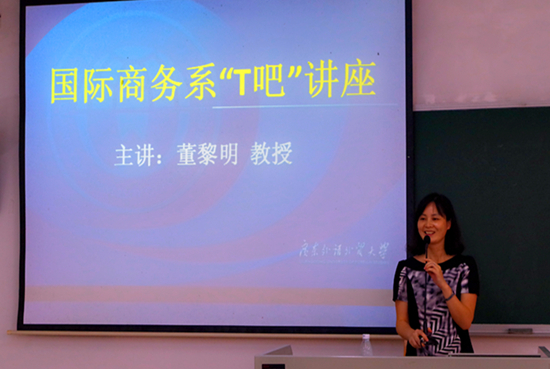 杨妙新作开讲致辞。她对董黎明和同学们的到来表示热烈的欢迎和衷心的感谢,并对“中文T吧”进行了介绍。“T吧”作为国际商务系的一大特色活动,长久以来,得到了广大师生的支持,同学们通过“T吧”,学习到一些课外知识,拓展了同学们知识面。