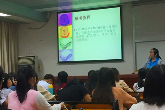 报考说明会由辅导员李惊雷主讲,16级英语、日语专科全体新生参加会议。李惊雷围绕准考证的办理以及统考报考等注意事项展开讲述。她向与会学生详尽讲解了准考证的办理和报考流程,特别强调本次报考因涉及新生准考证的办理,任何一个环节出错将直接影响学生报考;她针对准考证办理和报考容易出错的问题,多次提醒学生注意,避免再次发生错误延误报考。另外,针对11日进行准考证办理的身份证验证和电子摄像环节,李惊雷根据开放办的安排做了详尽部署,反复强调各环节各班级集合时间和地点。同时,她结合各专业教学计划,对学生报考科目提出建议。最后,李惊雷对学生们提出的疑问一一作出解答。
