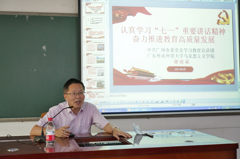 本网讯 9月28日下午,高等继续教育(公开)学院党委在白云山校区召开党史学习教育专题辅导报告会,特邀学校党史学习教育宣讲团成员、马克思主义学院院长谢迪斌教授主讲。学院全体教职工,白云山校区合作单位工作人员,学生党员代表等参加。报告会由学院党委书记邵兵主持。